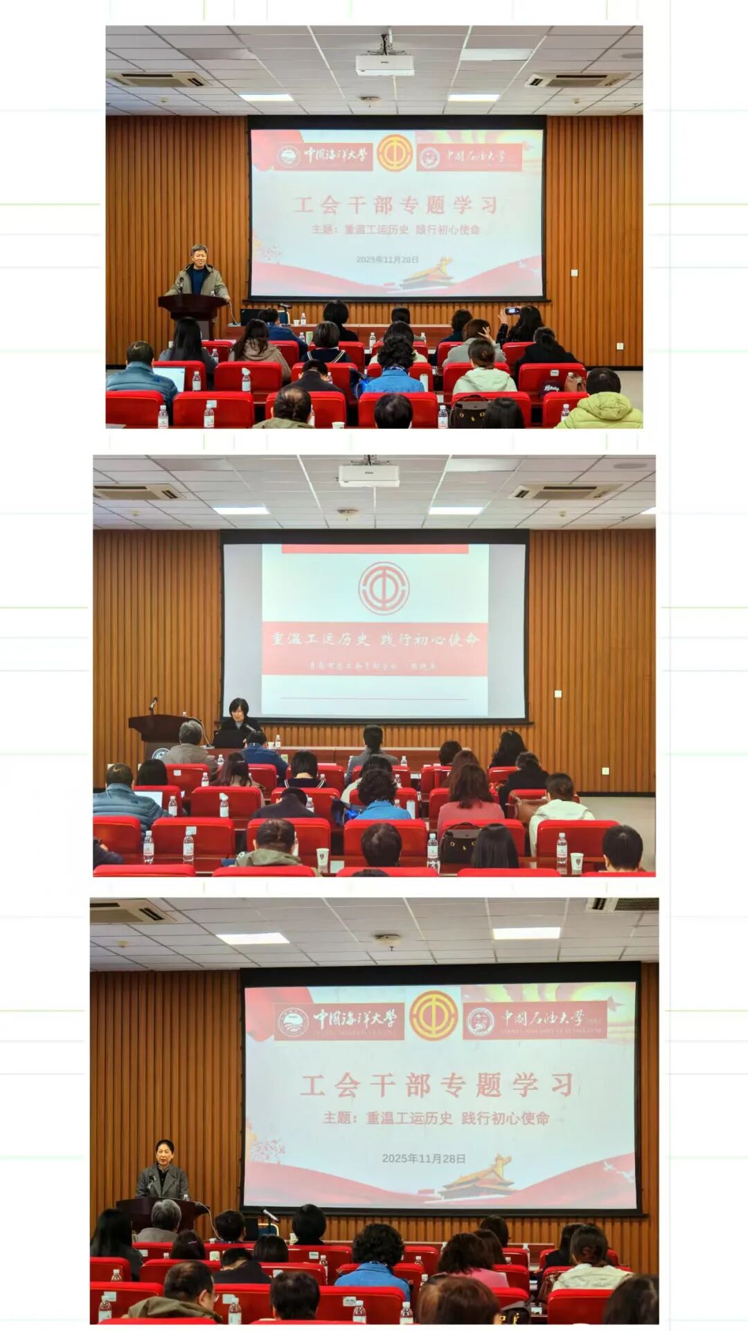 为深入学习贯彻落实党的二十届四中全会精神,学习贯彻习近平总书记在庆祝中华全国总工会成立100周年暨全国劳动模范和先进工作者表彰大会上的重要讲话精神,深刻领会新时代新征程我国工人运动的时代主题,充分发挥党联系职工群众的桥梁纽带作用,推动学校工会工作迈上新台阶,11月28日,校工会与中国石油大学(华东)工会联合开展工会干部“重温工运历史,践行初心使命”专题学习调研活动,在理论学习与实地调研中感悟初心使命,凝聚奋进力量。 活动由中国石油大学(华东)工会主席郭文主持。他表示,两校工会联合开展学习调研活动,是改革创新工会工作方式方法的一次新尝试,希望两校工会进一步加强联系和合作,共同提高工会干部理论素养和履职能力,为学校事业高质量发展贡献工会力量。 两校的专兼职工会干部共同聆听了青岛市总工会干部学校张晓杰老师 “重温工运历史,践行初心使命”的专题报告。报告中,张老师结合中国工会百年来波澜壮阔的光辉历程,以青岛工运史为主脉络,用大量的图片和史料详细介绍了青岛工人阶级和工会组织从形成到政治崛起再到成长壮大的历程,让工会干部更好地了解青岛工运史,学习中国工运史,铭记奋斗历程、传承红色基因,坚定理想信念,汲取前进力量。