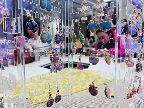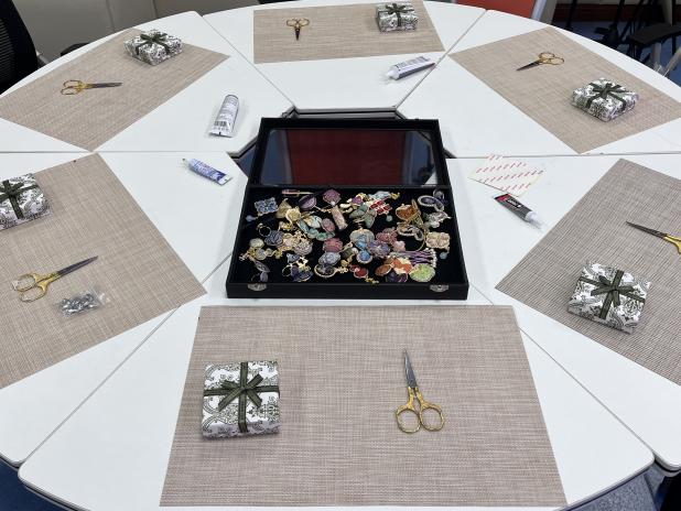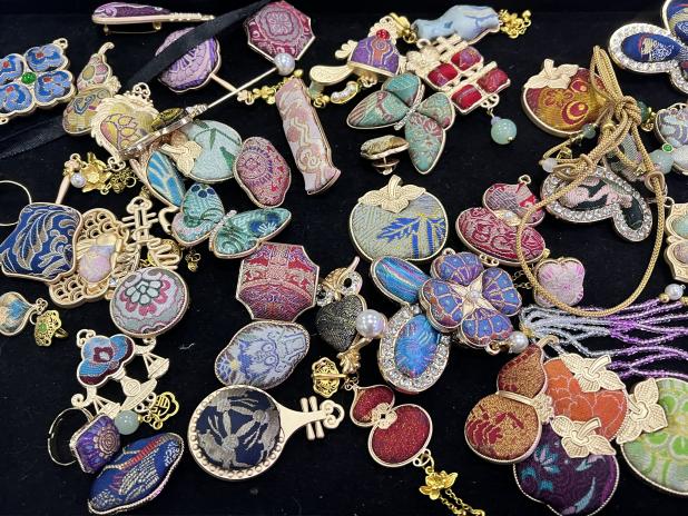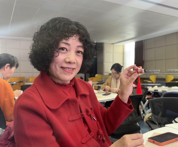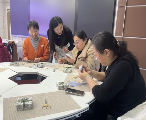 随后,女教职工们化身“手作匠人”,挑选面料与配饰,在老师指导下完成裁剪、拼接、粘合等工序,制作中相互交流技巧、分享灵感,经过近一个多小时的精心创作,一件件宋锦手作成品相继诞生。