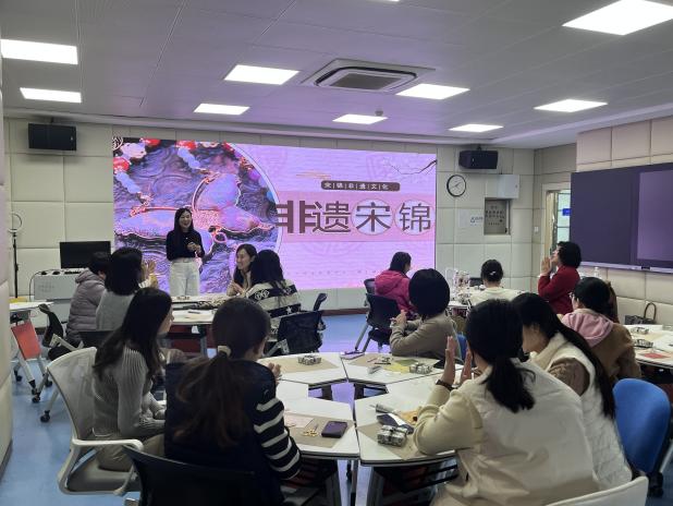 活动伊始,宋锦非遗传承人讲解了宋锦的历史源流、织造技艺、纹样寓意及手作技法,介绍了面料、针线、底托等手作工具与材料。