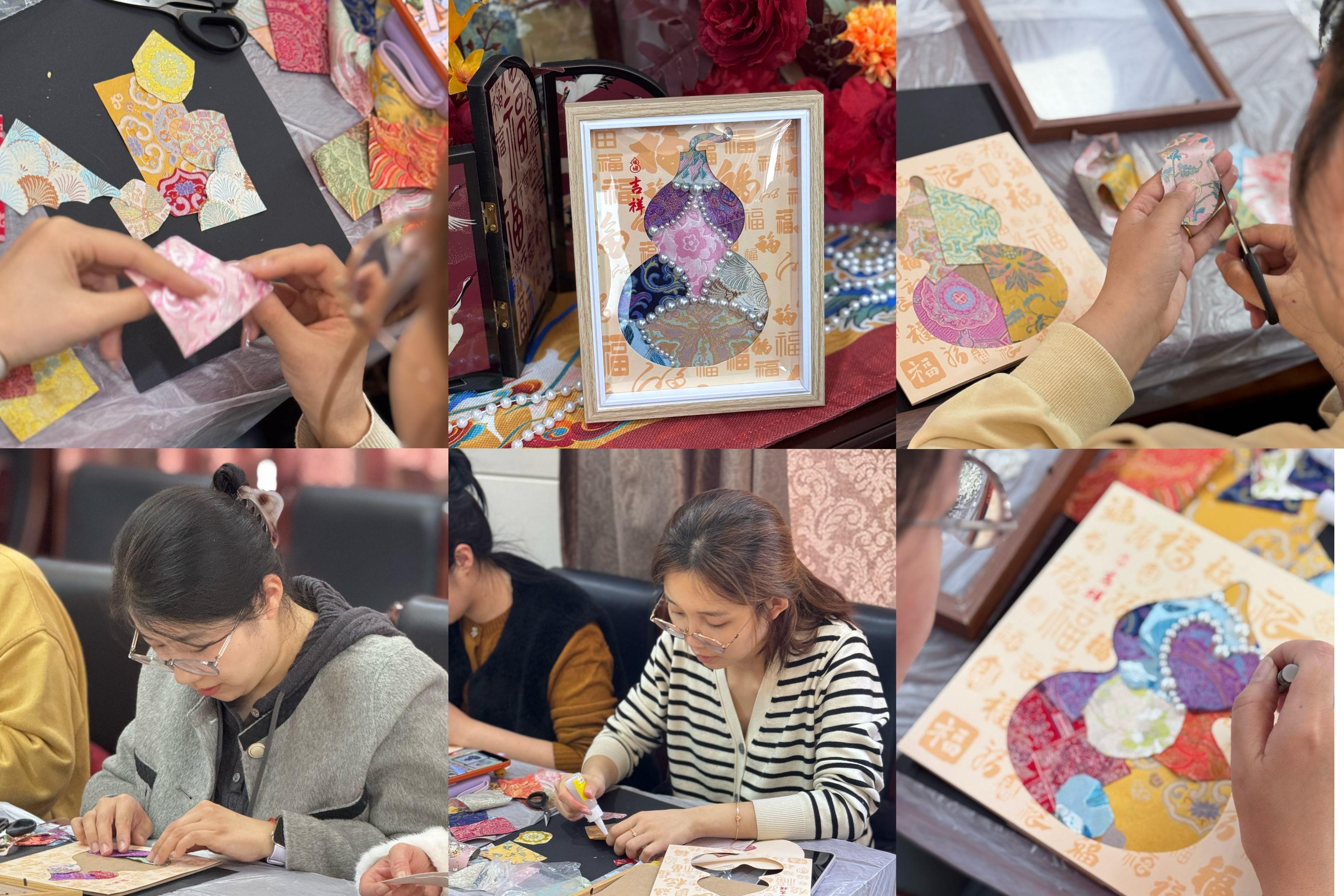 活动伊始,专业指导老师结合实例,生动讲述了宋锦源远流长的历史脉络与独特工艺价值,细致解读了“福禄”纹样承载的吉祥寓意,将非遗文化的魅力娓娓道来,为现场营造出浓厚而雅致的文化氛围。 实践环节中,平日里忙碌在各服务岗位上的女职工们,瞬间化身心灵手巧的 “手艺人”。在老师的耐心示范与细致指导下,大家凝神聚气,通过剪裁、构图、拼接、装饰等精妙工序,将一块块精美的宋锦面料,制作成了造型雅致、寓意祥瑞的 “福禄” 摆件。过程中大家相互交流技巧,分享喜悦,现场暖意融融,欢声笑语此起彼伏。