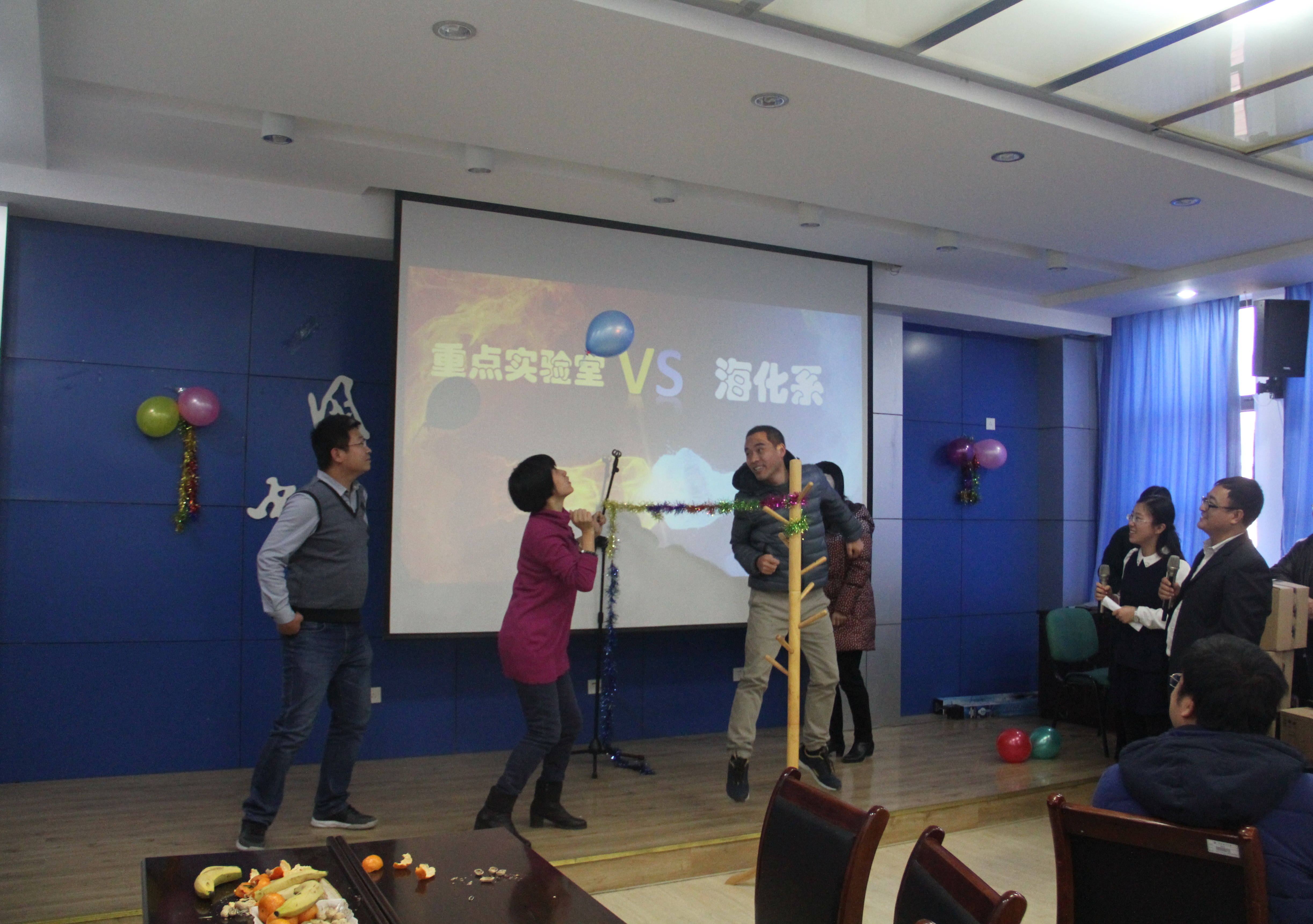 2016年12月30日下午,化学化工学院迎新年茶话会在学院多功能厅举行。100余位教职工欢聚一堂,喜迎新年。 茶话会在两位年轻主持人张大海和徐文琦幽默的开场白中开始。本次茶话会设计分为抽奖、游戏及节目表演环节,学院工会为参加茶话会的每位教职工都准备了精美的新年伴手礼,同时还发放了一张抽奖号码参与抽奖。 节目开始由海化系姬泓巍老师带来2首诗朗诵,接下来的游戏环节是你来比划我来猜,由每个工会小组出2人参加,考验2人之间的默契度。接着化学实验中心李苓老师带来深情款款的《思恋》,歌声博得了大家的阵阵掌声。顶气球游戏将活动带出了一波小高潮,在激烈的头球、脚球及吹球中,行政、海化系及重点实验室三个工会小组获胜。一轮抽奖过后,化学系工会小组四位老师为大家带来了方言版《泰坦尼克号》,滑稽的方言引爆了观众的笑声。接下来是重点实验室六位年轻教师的合唱《明天会更好》、行政工会小组王晓鹏老师的吉他独奏独唱《匆匆》以及化学版《青花瓷》,优美的歌声为大家送去了新年的祝福。第二轮抽奖后,接着进行的是“一样不一样”和看图猜迷游戏。随后,化工系为大家带来了滑稽舞蹈《大王叫我来巡山》,滑稽的舞蹈动作将茶话会带到了高潮。随后化工系10余位教师为大家又带来了合唱《走进新时代》,祝福美好明天。伴随着最后一轮抽奖活动,茶话会圆满落幕。 整个茶话会过程中,大家笑声不断,掌声不停,热情洋溢,其乐融融。本次茶话会活动,不仅活跃了学院氛围,愉悦了身心,还增进了教职工彼此间的交流,增强了学院的凝聚力。